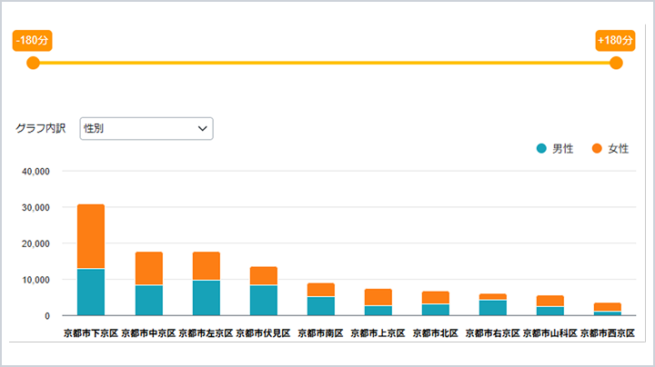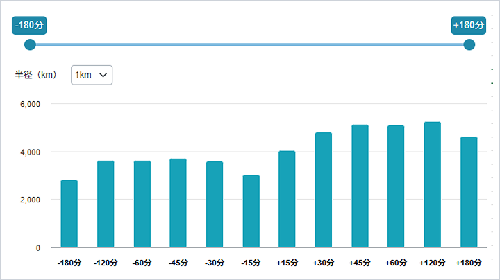 目的地への来訪前後180分の範囲内で、周辺の立ち寄り者数をグラフで表示