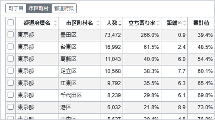都道府県・市区町村・町丁目単位で、来訪前後の立ち寄り者数をリストで表示