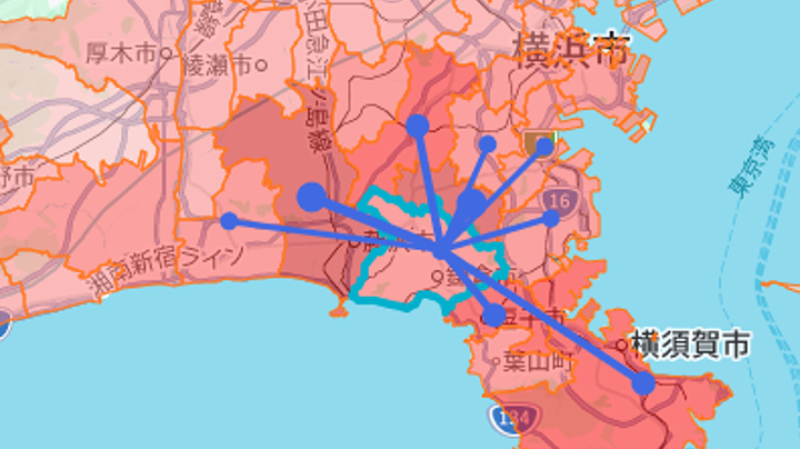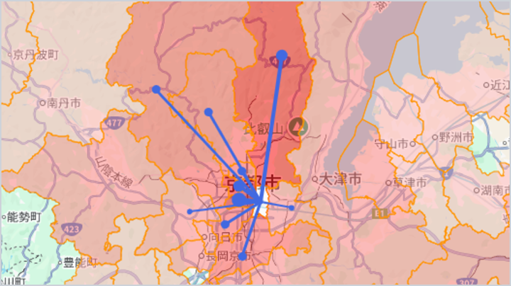 都道府県・市区町村・町丁目単位で、来訪前後の立ち寄り者数の大小をカラーグラデーションと線形で直感的に表示