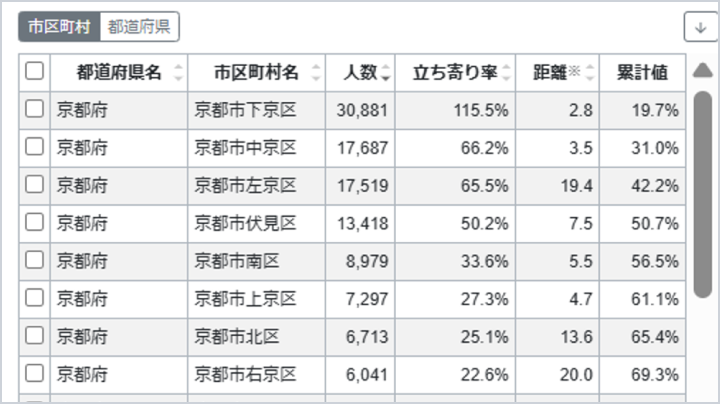 都道府県・市区町村単位で、目的地来訪前後の立ち寄り者数をリストで表示