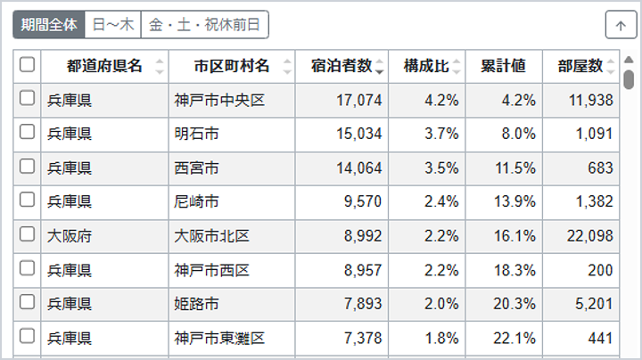 市区町村単位で、⽬的地に来訪した日の宿泊者数をリストで表示