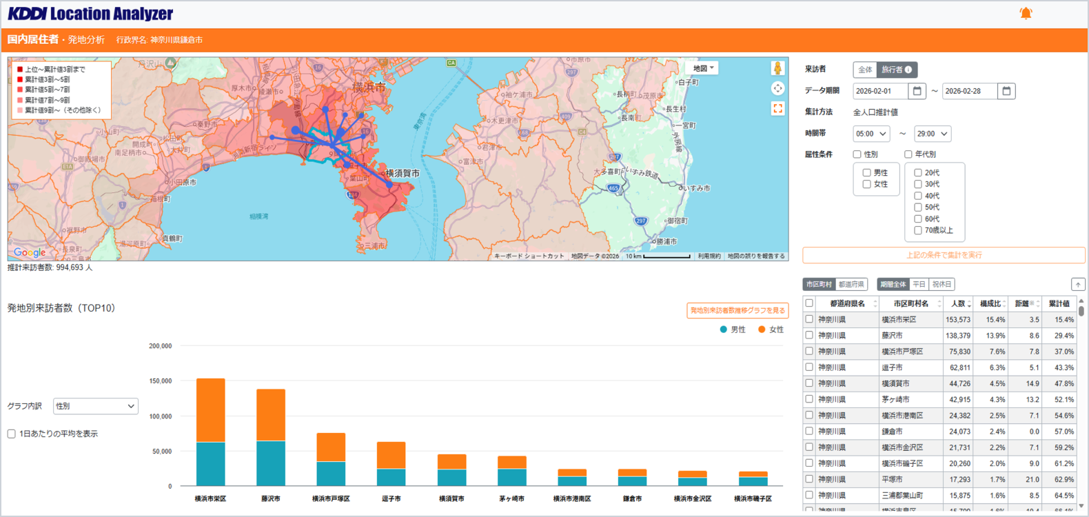 都道府県・市区町村単位で、目的地への旅行者数を発地別にリストで表示